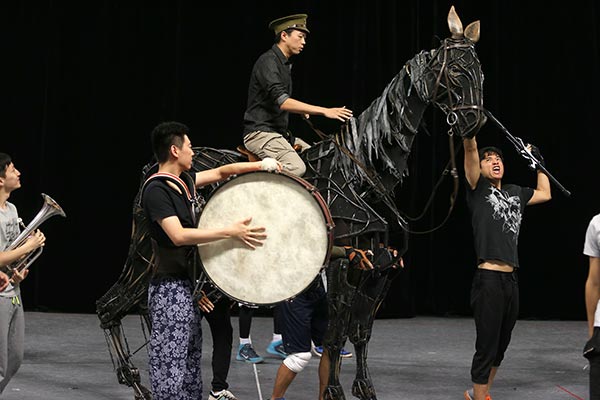 It takes three actors to manipulate the life-size horse in the play War Horse. [Photo by Jiang Dong / China Daily] |