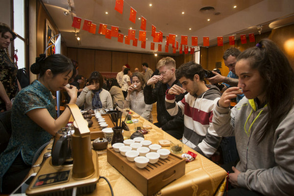 A Chinese teacher smells a cup of tea at a tea ceremony in Buenos Aires in Argentina on Sep 25, 2015. It was the second Confucius Institute Day and the Institute of the Universidad de Buenos Aires offered a one-stop experience of Chinese culture. [Photo/Xinhua] |