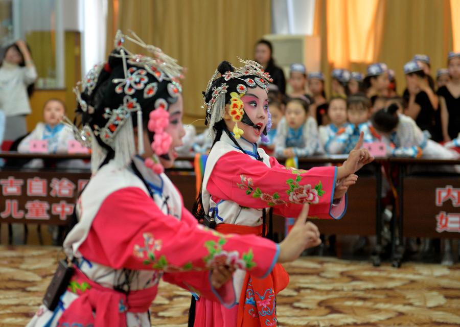 Young enthusiasts of traditional Chinese Peking Opera perform a play in Hohhot, capital of North China's Inner Mongolia autonomous region. [Photo/Xinhua]