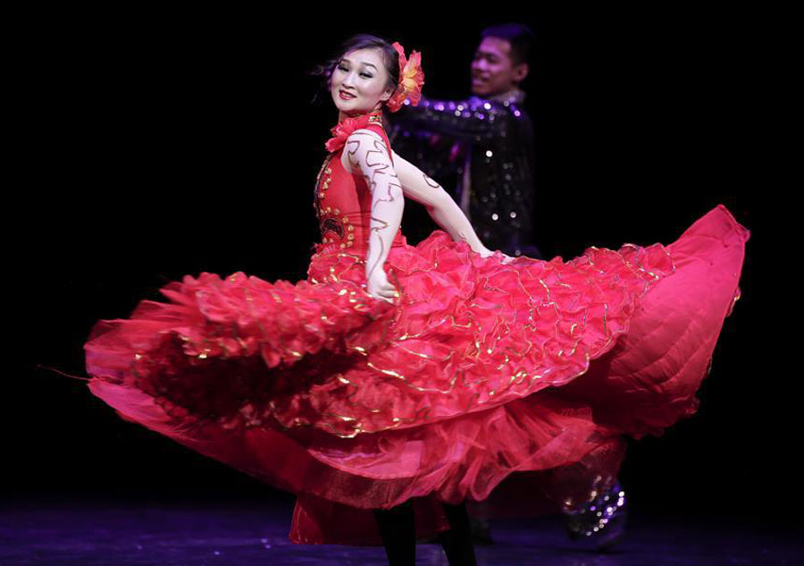 Artists with China's Song and Dance Company of Jilin perform in the Colsubsidio Roberto Arias Perez Theater, in Bogota, Colombia, on Jan. 22, 2016.China's Song and Dance Company of Jilin, which visited Colombia for the first time, will carry out two performances in Bogota. [Xinhua/Jhon Paz]