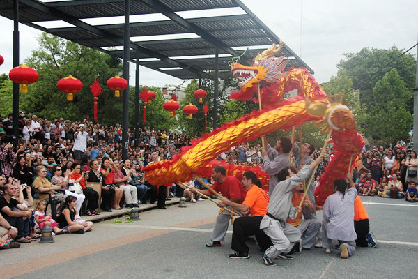 Artists perform a dragon dance at the event to celebrate Chinese New Year in Montevideo, Uruguay, Feb 7, 2016. [Photo/uy.china-embassy.org]