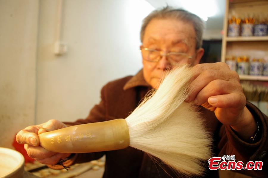 Folk artist Sheng Songbai makes writing brushes at his studio in Jingdezhen city, East China's Jiangxi province. Now 80 years old, Sheng still uses traditional crafts to make writing brushes through a complex process that includes selecting the right animal hair to meet diverse writing or painting requirements and fitting shafts made of local bamboo. He learned the skill from his father beginning at the age of 13. His craftsmanship is recognized by the provincial government as a cultural heritage. [Photo/China News Service]