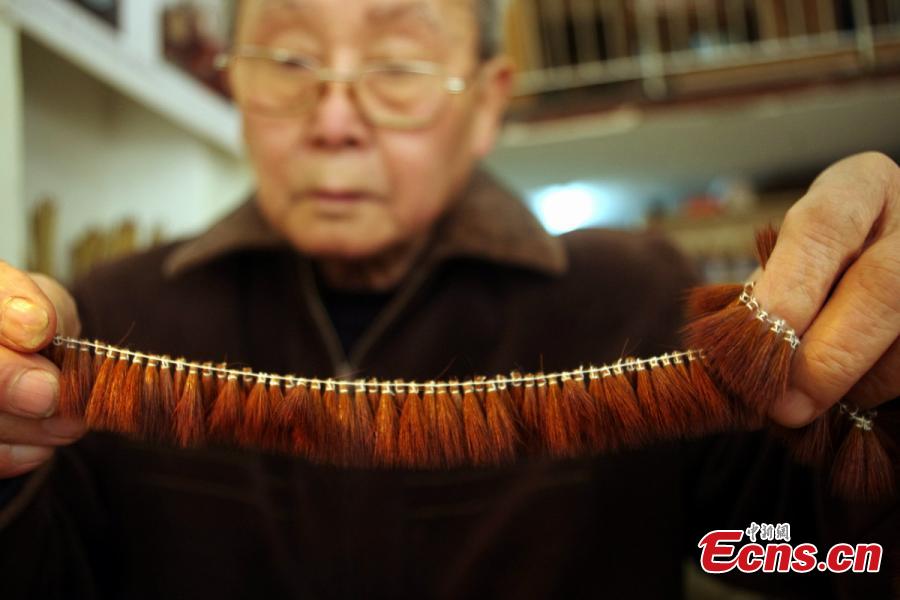 Folk artist Sheng Songbai makes writing brushes at his studio in Jingdezhen city, East China's Jiangxi province. Now 80 years old, Sheng still uses traditional crafts to make writing brushes through a complex process that includes selecting the right animal hair to meet diverse writing or painting requirements and fitting shafts made of local bamboo. He learned the skill from his father beginning at the age of 13. His craftsmanship is recognized by the provincial government as a cultural heritage. [Photo/China News Service]