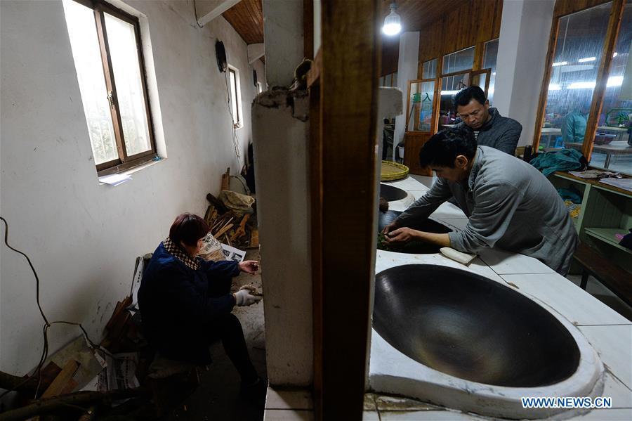 Yan Jielong bakes Biluochun tea in Dongshan town, Suzhou city of East China's Jiangsu province, March 14, 2016. Yan Jielong, 53 years old, inheritor of ancient making technique of Chinese tea Biluochun, has learnt the skill since he was 16 years old. Requiring high standard of making technique, Biluochun tea is the speciality of Dongshan town, where the people who know the ancient making technique are mostly in their 50s. Yan and other inheritors have taken video of their method and hope they may someday open a school for it and pass on the technique to youngsters. [Photo/Xinhua]