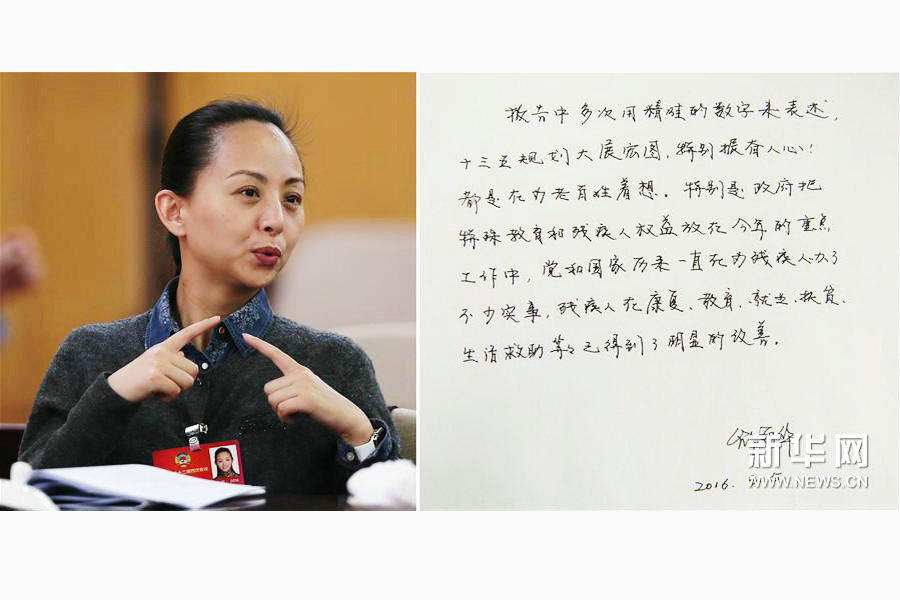 Tai Lihua: "The 13th five year plan is awesome. The Chinese government prioritizes the special education and protection of the benefits and rights of people with disabilities in 2016." [Photo/Xinhua]