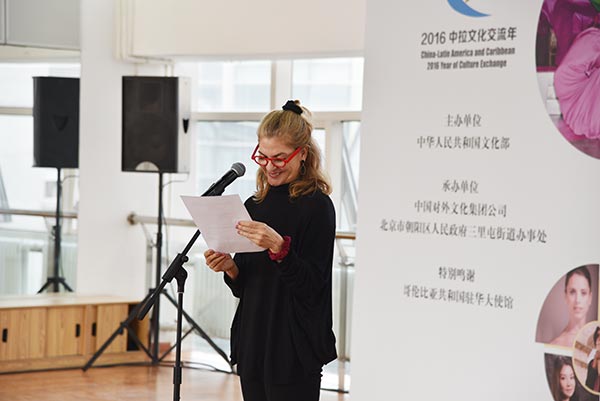 Rosanna Lignarolo, team leader of the Columbian dance troupe, makes a speech during the event. [Photo/chinadaily.com.cn]