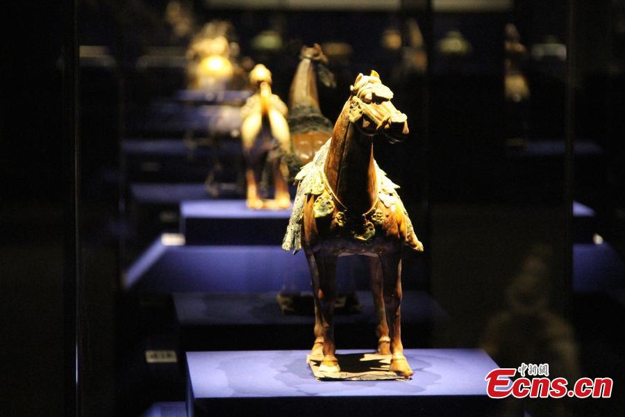 An exhibition of tri-colored glazed pottery works of the Tang Dynasty (618-907) is held at the Shaanxi History Museum in Xi'an city, capital of Northwest China's Shaanxi province, March 22, 2016. About 130 tri-colored glazed pottery works selected from the dynasty's two capitals, Chang'an (present-day Xi'an) and Luoyang in Henan province, were displayed in the exhibition. [Photo/China News Service]