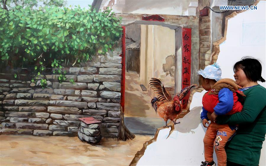 A woman and a child look at a 3D painting at Hongshi village of Tancheng county, East China's Shandong province, March 30, 2016. [Photo/Xinhua]