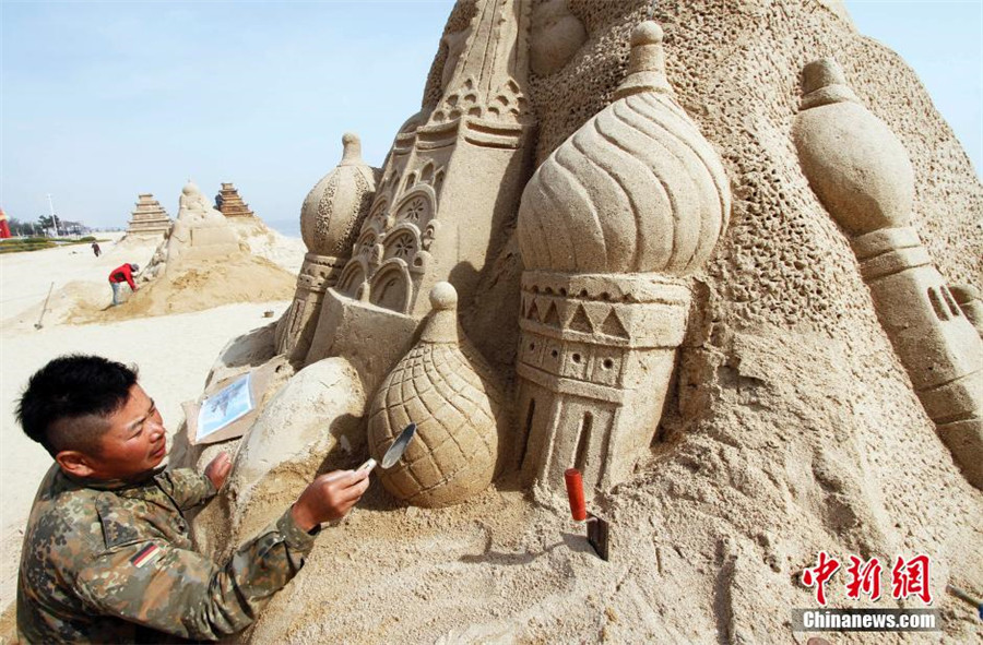 A sculptor carefully works on the intricate design of a sand sculpture in the shape of a castle in Weihai city, East China's Shandong province, March 30, 2016. [Photo/Chinanews.com]