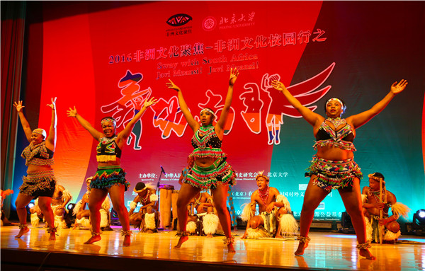 The troupe also attended the activity Sway with South Africa at Peking University on Monday and presented African classical drum music and dances.