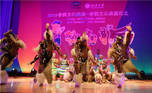 Members of the song and dance troupe Music Fest of South Africa give a performance during the Sway with South Africa activity at Peking University in Beijing, May 2, 2016. [Photo/Chinaculture.org]