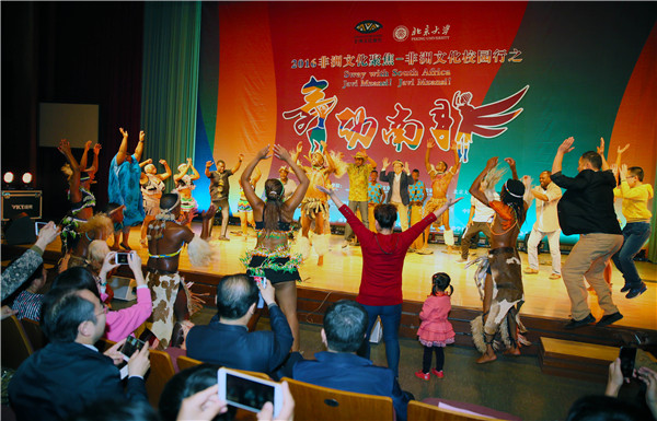 Members of the song and dance troupe Music Fest of South Africa interact with the audience after a performance at Peking University in Beijing, May 2, 2016. [Photo/Chinaculture.org]