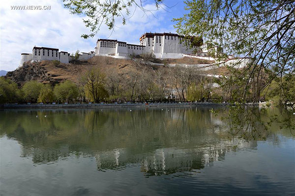 Photo taken on April 15, 2015 shows the scenery of Longwangtan Park in Lhasa, capital of southwest China's Tibet Autonomous Region. In the past 65 years, the city of Lhasa, which expanded its acreage to 100 square meters, has turned to be a mixed city, both ancient and modern. The Tibet region realized peaceful liberation on May 23, 1951. [Photo/Xinhua] |