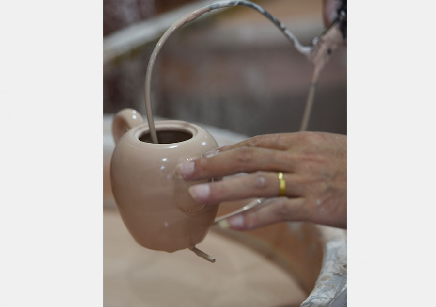 A worker is glazing the pottery. [Photo by Zhang Jiancheng/Asianews photo]
