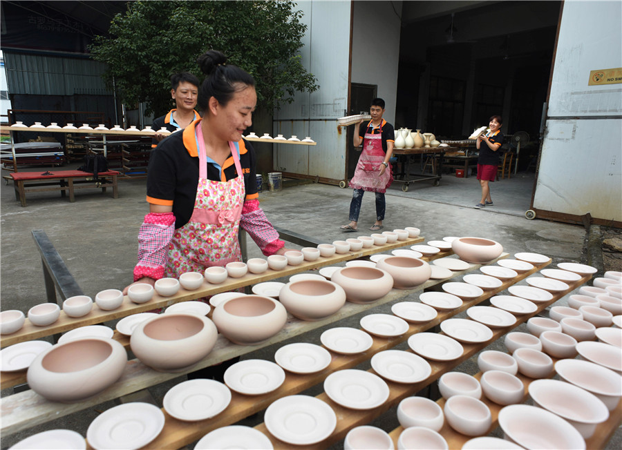 A worker is drying the pottery. [Photo by Zhang Jiancheng/Asianews photo]