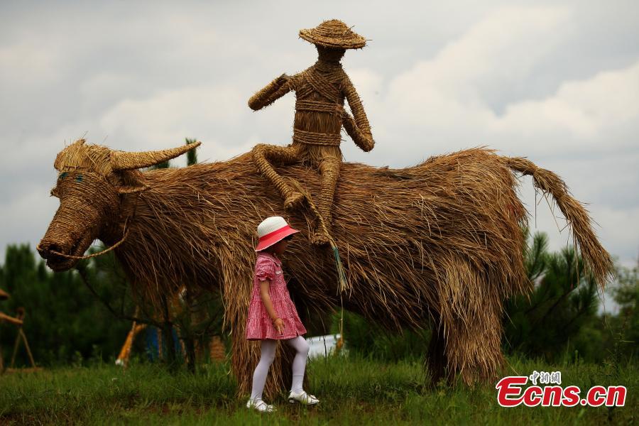 Children play in front one of the scarecrow sculptures in Kunming, Yunnan province on July 5, 2016. [Photo/China News Service]