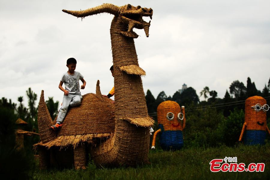 Children play in front one of the scarecrow sculptures in Kunming, Yunnan province on July 5, 2016. [Photo/China News Service]