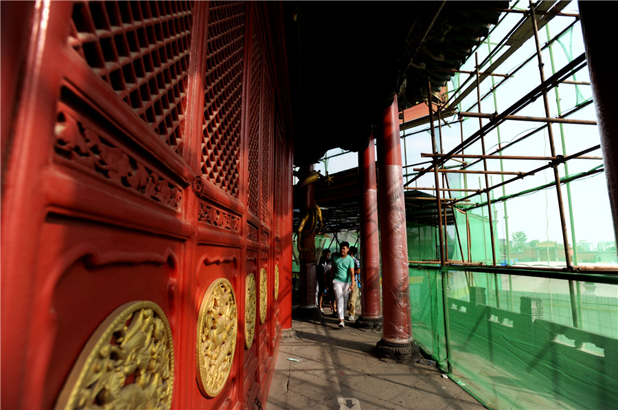 Tourists walk past the Dazhengdian (Hall of Great Affairs) in Shenyang Imperial Palace in Shenyang, capital of Northeast China's Liaoning province, on July 19, 2016. [Photo/Xinhua]