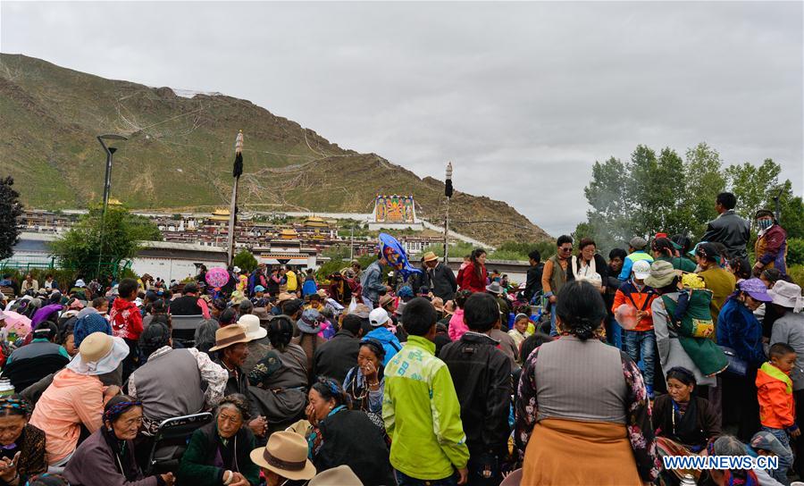 Believers attend the unveiling of the Buddha event at the Zhaxi Lhunbo Lamasery in Xigaze, Southwest China's Tibet autonomous region, July 20, 2016. The annual ceremony was concluded on Wednesday. [Photo/Xinhua]