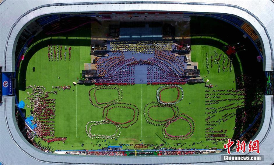 An aerial view of the opening ceremony of the 9th Kangba Arts Festival in Kangding of Ganzi Tibetan autonomous prefecture, Southwest China's Sichuan province, on Aug 9, 2016. The festival started in 1995 and serves as a platform to showcase the rich natural and cultural heritage of the Kangba areas. [Photo/Chinanews.com]
