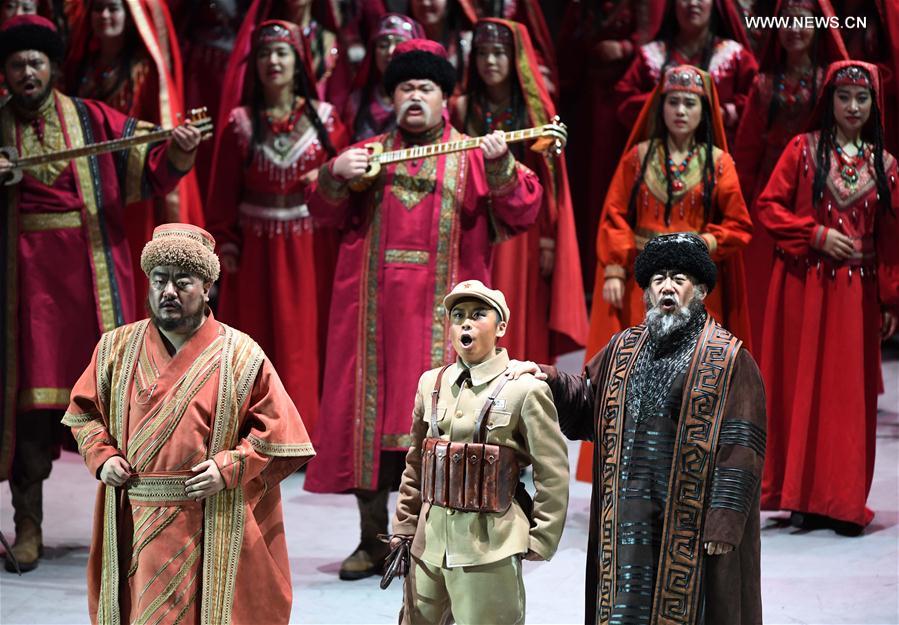 Actors and actresses perform in an opera telling a story between a soldier and a spy on Pamirs during the 5th Minorities Art Festival of China in Beijing, capital of China, Aug 16, 2016. The festival will last till Sept 14. [Photo/Xinhua]