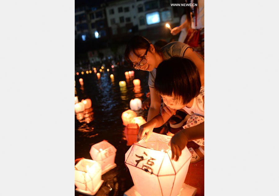 A girl puts a lantern into the river during a traditional lantern fair in Ziyuan county, South China's Guangxi Zhuang autonomous region, Aug 16, 2016. People here put lanterns into the river in the evening during the fair to pay tribute to ancestors and pray for happiness. [Photo/Xinhua]