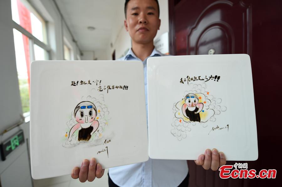 Li Jiayang shows his painting of swimmer Fu Yuanhui made with jam on a plate in Taiyuan city, capital of North China's Shanxi province, Aug 17, 2016. Fu has become an Internet darling for her winsome facial expressions and joyful over-enthusiasm during the Rio Olympics. [Photo/China News Service]