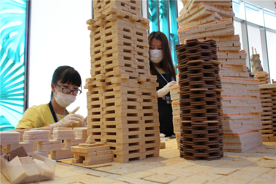Student volunteers build models of architecture in various shapes and colors by using cookies in East China's Shanghai municipality on Aug 24, 2016. The construction of the biscuit city lasts from Aug 22 to 28, and then guests will be invited to devour it. Performance artist Song Dong believes that the week long construction and destruction through eating is art, symbolizing the desires of human beings. It's the desire of human beings to construct a city or turn it into ruins. [Photo by Gao Erqiang/Asianewsphoto]