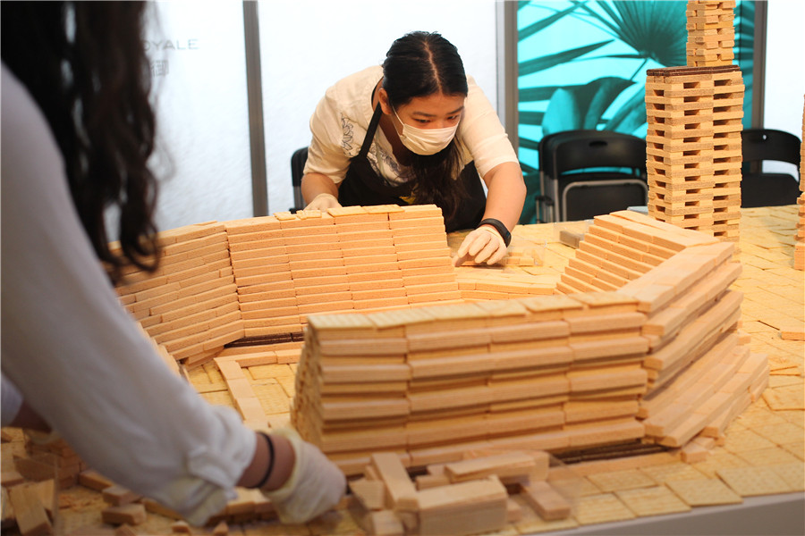 Student volunteers build model architecture in various shapes and colors by using cookies in East China's Shanghai municipality on Aug 24, 2016. The construction of the biscuit city will last from Aug 22 to 28, then guests will be invited to devour it. Performance artist Song Dong believes the week long construction and destruction through eating is art, symbolizing the desires of human beings. It's the desire of human beings to construct a city or turn it into ruins. [Photo by Gao Erqiang/Asianewsphoto]