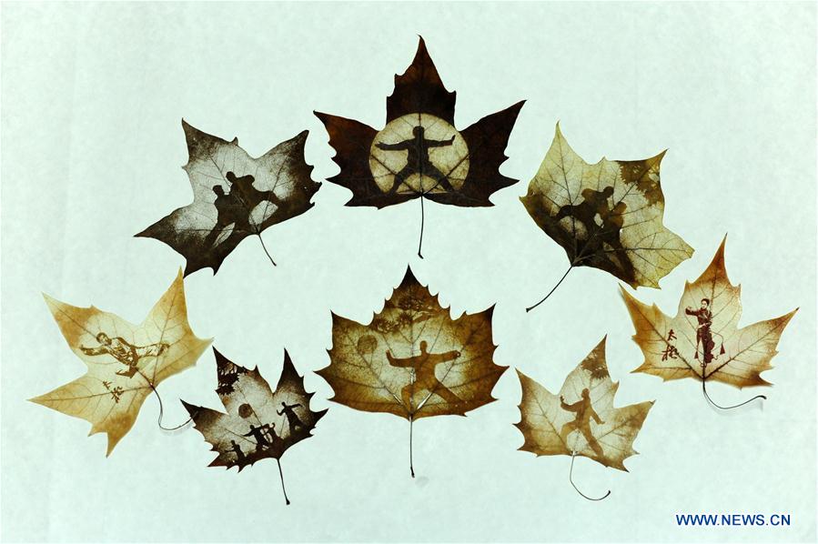 Photo taken on Aug 24, 2016 shows leaf miniatures works created by Chen Liming, the heir of the Chen Leaf Miniatures, in Jiaozuo, Central China's Henan province. Chen Leaf Miniatures, originated in the Qing Dynasty (1644-1911), was listed as part of Henan's intangible cultural heritage. [Photo/Xinhua]