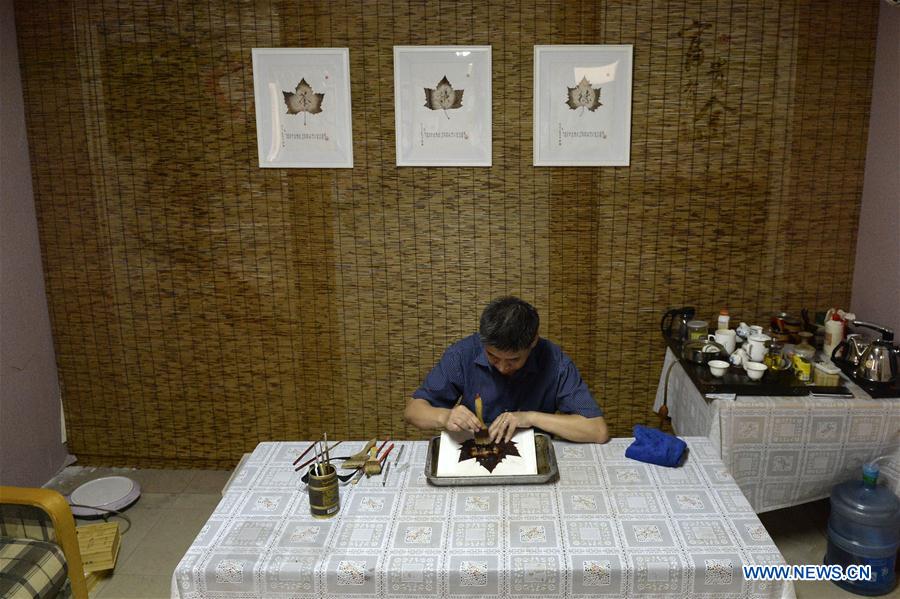 Chen Liming, the heir of the Chen Leaf Miniatures, creates a leaf miniature in Jiaozuo, Central China's Henan province, Aug 24, 2016. Chen Leaf Miniatures, originated in the Qing Dynasty (1644-1911), was listed as part of Henan's intangible cultural heritage. [Photo/Xinhua]