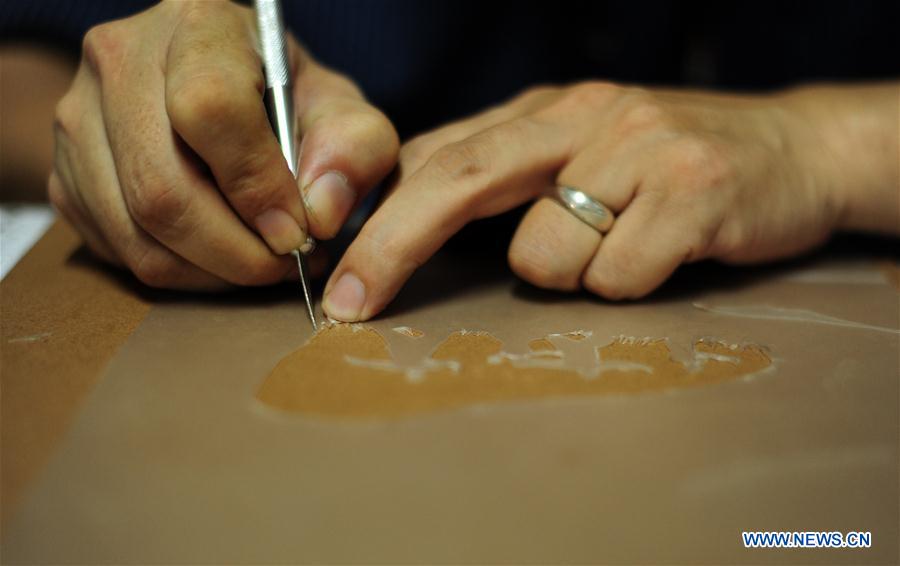 Chen Liming, the heir of the Chen Leaf Miniatures, carves a mould in Jiaozuo, Central China's Henan province, Aug 24, 2016. Chen Leaf Miniatures, originated in the Qing Dynasty (1644-1911), was listed as part of Henan's intangible cultural heritage. [Photo/Xinhua]