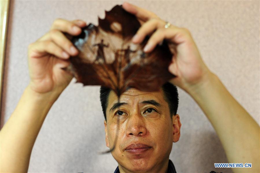 Chen Liming, the heir of the Chen Leaf Miniatures, checks his work in Jiaozuo, Central China's Henan province, Aug 24, 2016. Chen Leaf Miniatures, originated in the Qing Dynasty (1644-1911), was listed as part of Henan's intangible cultural heritage. [Photo/Xinhua]