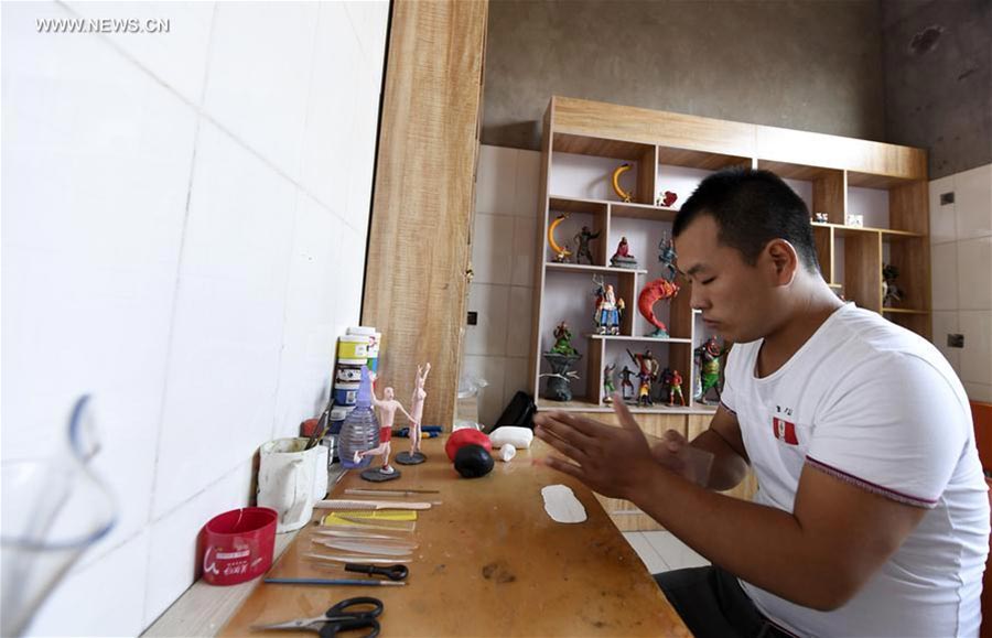 Qi Hongning works on his dough sculpture in Dashizhuang village of Wenfeng district in Anyang, Central China's Henan province, Aug 28, 2016. [Photo/Xinhua]