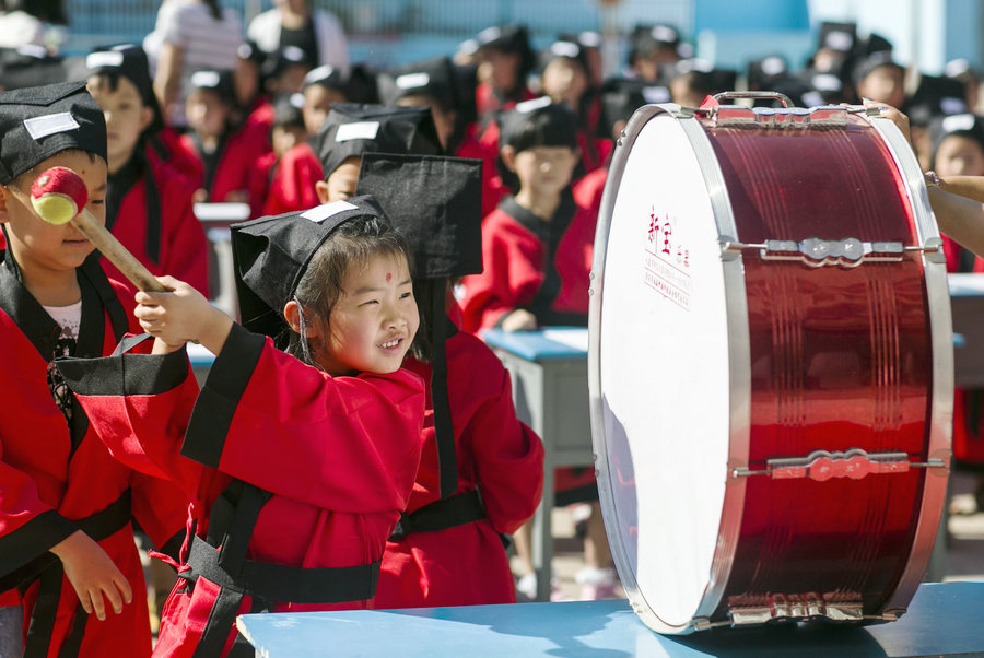 A pupil beats the drum during a traditional Chinese opening ceremony of the new semester, Xingtai, Hebei province, Aug 31, 2016. The school aimed to let students experience more traditional Chinese culture through the ceremony. [Photo/Xinhua]