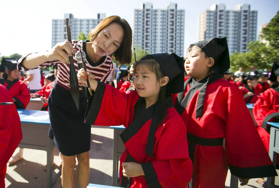 A teacher shows students how to use writing brushes during a traditional Chinese opening ceremony of the new semester, Xingtai, Hebei province, Aug 31, 2016. [Photo/Xinhua]
