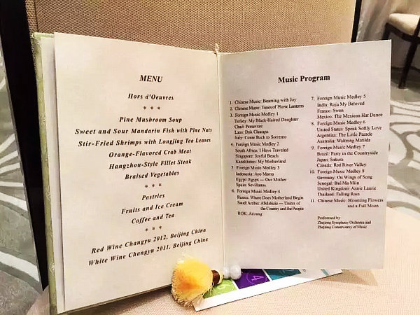 Menu made of silk for the G20 Summit held in Hangzhou. [Photo/WeChat Account of Qianjiang Evening News]