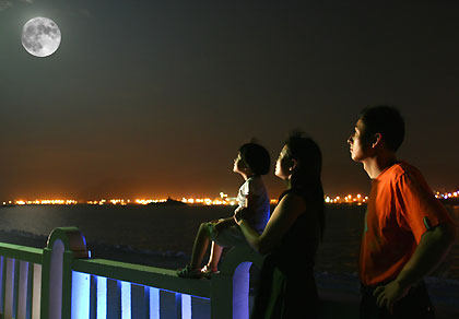 A girl and her parents watch the moon on the bulwark in the coastal city of Lianyuan, east Jiangsu province.?[file photo] |