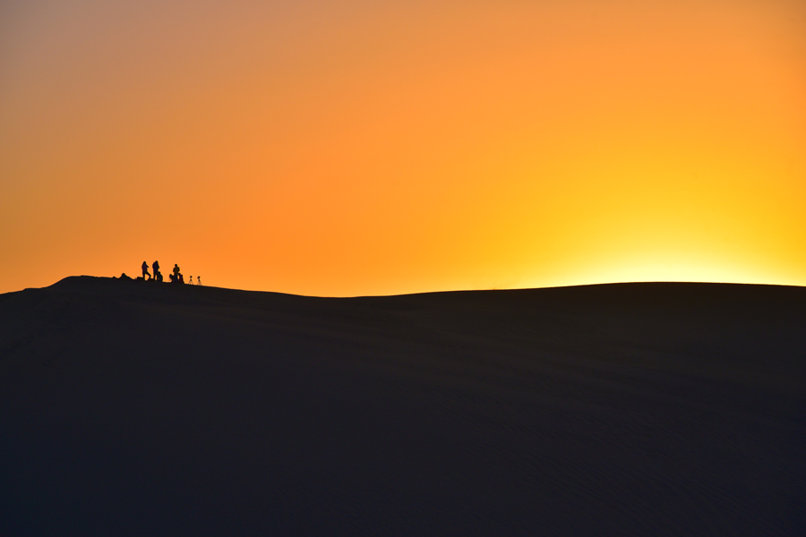 Several tourists stand in the desert to watch the sunrise. [Photo by Zhang Xingjian/Chinaculture.org]