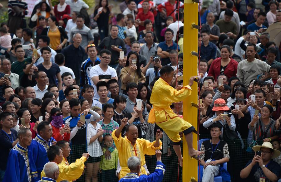 Villager Lan Renzhen, 66, performs "climbing on blades" during a local folk activity in Zhongtuan village of Wuping county, Southeast China's Fujian province, Nov 14, 2016. [Photo/Xinhua]