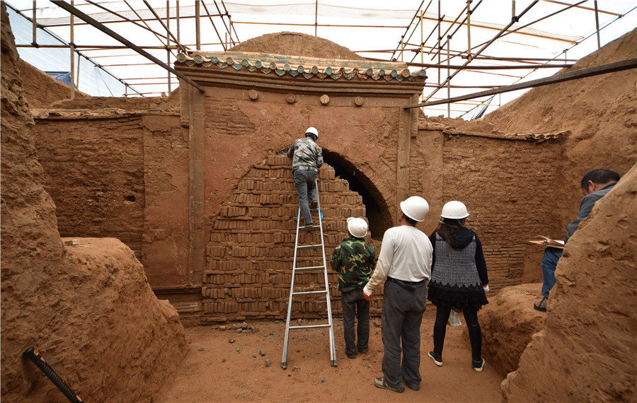 Archeologists dismantle the brick door that sealed the inner chambers of King Zhouyi's tomb in Xingyang city, Central China's Henan province, Oct 9, 2016. [Photo/Xinhua]