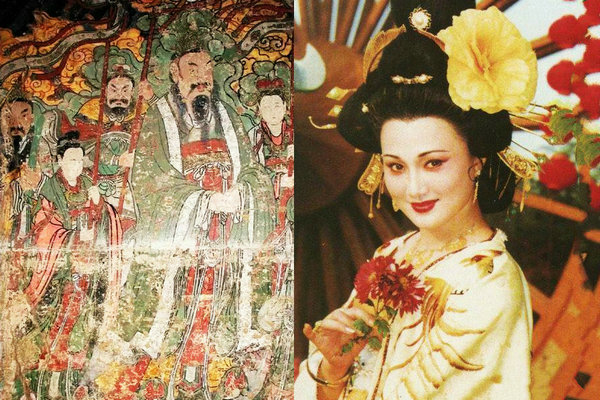 Li Longji portrayed in a fresco (left); Yang Yuhuan played by Lin Fangbing in 1990 TV series Tang Ming Huang. [File photo] |
