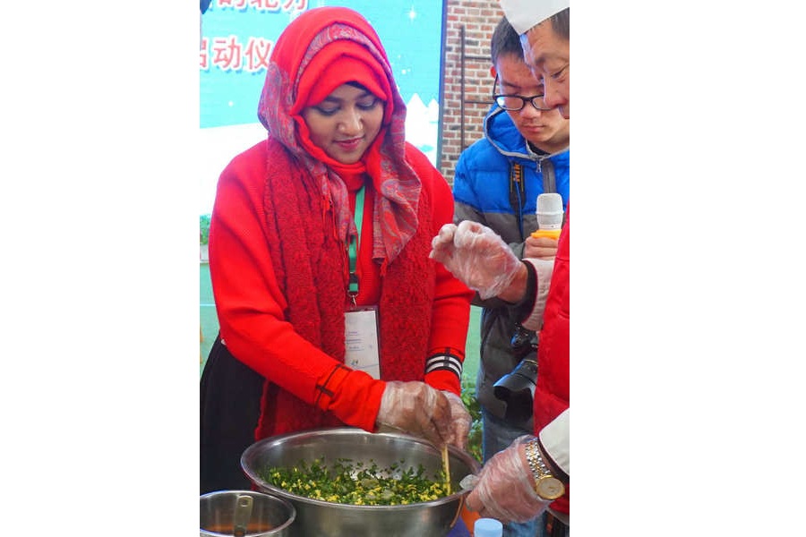 A foreign guest tries her hand at making dumplings to celebrate the upcoming Chinese Spring Festival in Tonghua city, Jilin province, Jan 20, 2017. [Photo by Bi Nan/ chinadaily.com.cn]