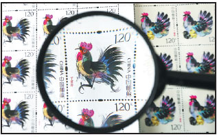 Rooster-themed stamps to celebrate the Year of the Rooster are displayed at a post office in Weifang, Shandong province, on Tuesday.Zhang Chi / For China Daily |