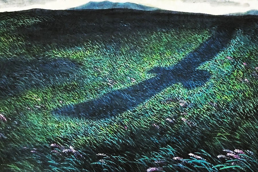 With large herds of camels in black and white, running horses on steep hills, the enlarged shadow of a flying eagle and white swans gliding across an azure lake near a dark blue hill, Shu poetically conveys the strong vitality and beauty of nature along the Silk Road.