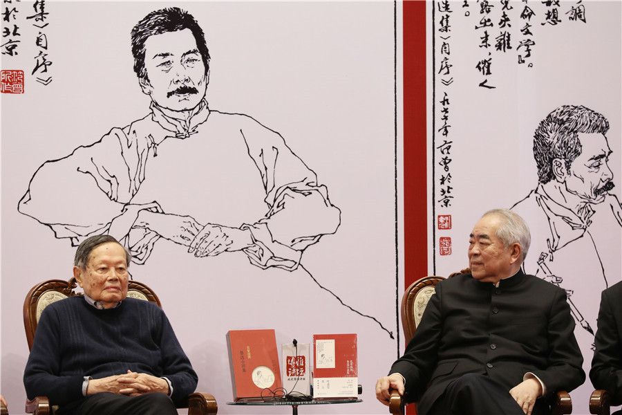 Nobel Prize laureate in physics Yang Zhenning (left), and Director of Chinese Traditional Painting Research Institute of Peking University Fan Zeng at the book launch in Beijing, March 22, 2017. [Photo by Zhu Xingxin/China Daily]