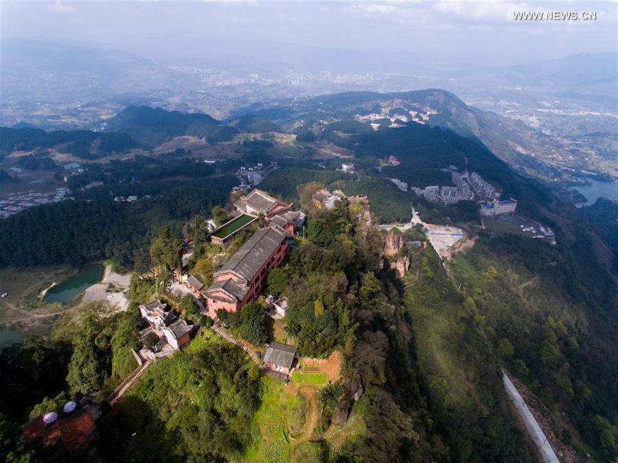 Aerial photo taken on March 22, 2017 shows the Jingyin Temple on a cliff of Gujian Mountain in Qijiang district of Southwest China's Chongqing. The ancient Jingyin Temple was initially built in the Song Dynasty (960-1279).[Photo/Xinhua]