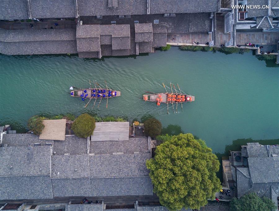 Aerial photo taken on March 29, 2017 shows a boat competition to celebrate the upcoming Sanyuesan Festival at Xizha scenic spot in Hangzhou, capital of East China's Zhejiang province. The Sanyuesan Festival is celebrated on the third day of the third lunar month. [Photo/Xinhua]