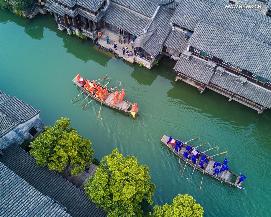 Aerial photo taken on March 29, 2017 shows a boat competition to celebrate the upcoming Sanyuesan Festival at Xizha scenic spot in Hangzhou, capital of East China's Zhejiang province. The Sanyuesan Festival is celebrated on the third day of the third lunar month. [Photo/Xinhua]