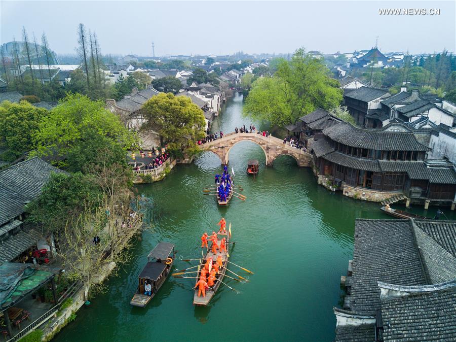 Aerial photo taken on March 29, 2017 shows a boat competition to celebrate the upcoming Sanyuesan Festival at Xizha scenic spot in Hangzhou, capital of East China's Zhejiang province. The Sanyuesan Festival is celebrated on the third day of the third lunar month. [Photo/Xinhua]